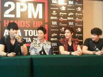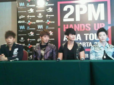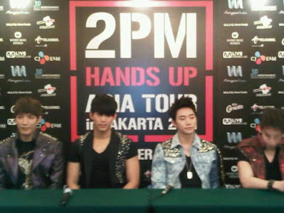 On November 10th 2011, one day before their Hands Up Asia Tour in Jakarta-Indonesia Concert, 2PM held a press conference and fan signing. About 17.00WIB (5PM), they started the conference. 2PM said that their favorite country is Indonesia because the fans here is so excited for them!Taec also added,Indonesia Hottest is the HOTTEST!